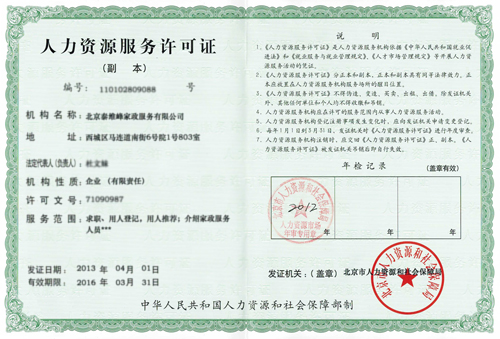 國(guó)家商務(wù)部家政典型企業(yè),擁有人力資源和社會(huì)保障局頒發(fā)正規(guī)服務(wù)資質(zhì)